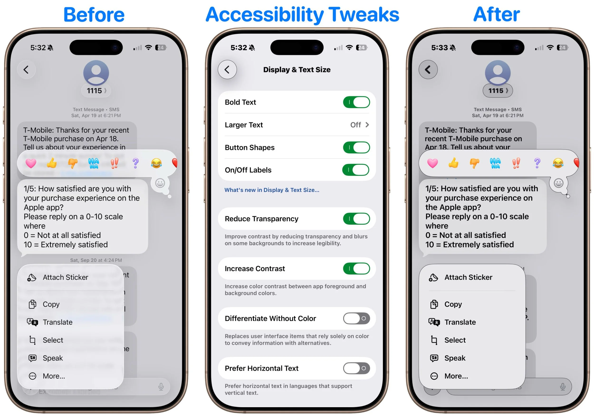 Reduce Transparency: Turning on Settings > Accessibility > Display & Text Size > Reduce Transparencysignificantly improves Liquid Glass readability by making translucent panels opaque, adding solid backgrounds, and reducing blur. On the Mac, this setting restores the solid menu bar. However, Reduce Transparency may make certain aspects of the interface look awkward, such as when a previously transparent toolbar suddenly covers a much larger part of the screen.