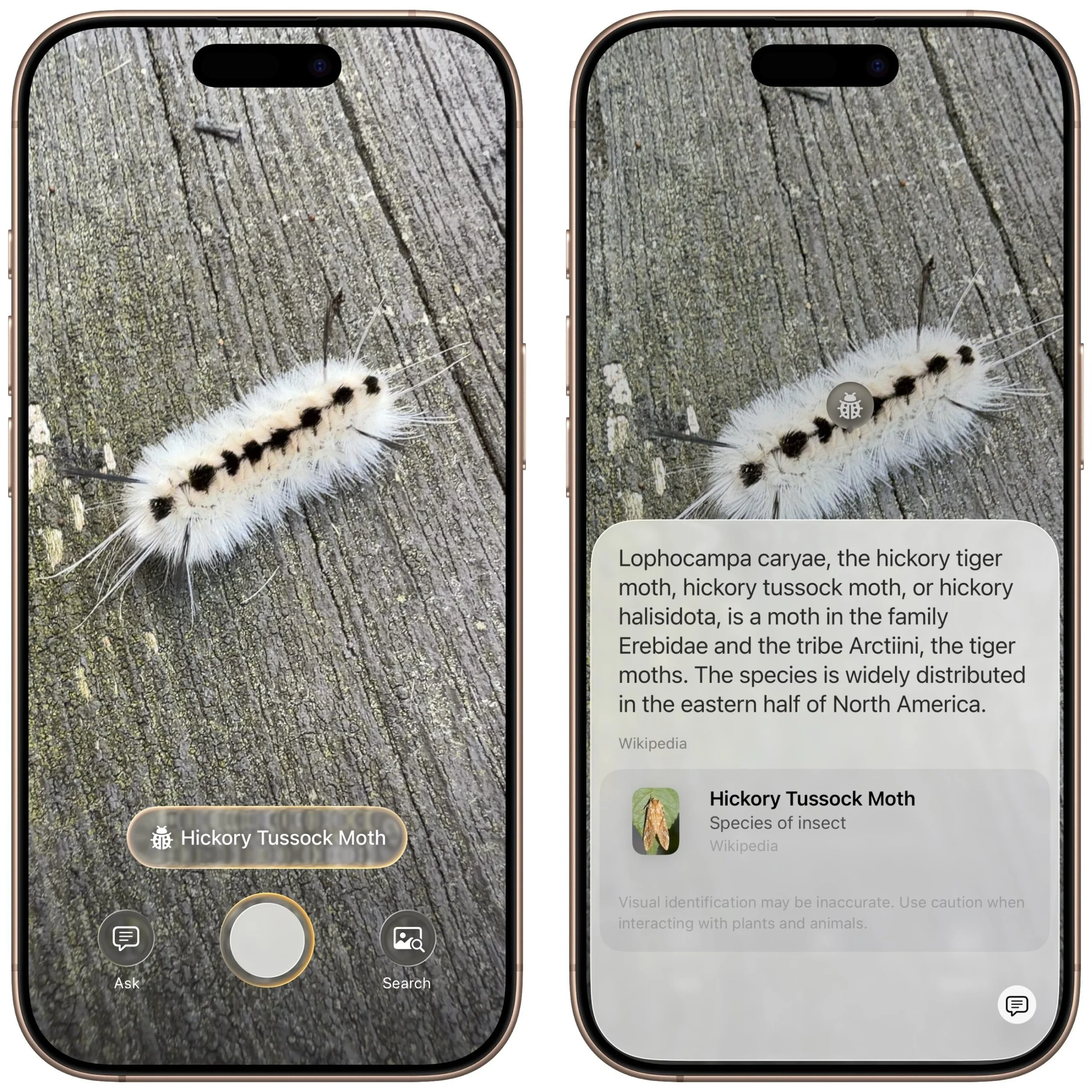 Recognized objects: When visual intelligence identifies an object, such as a specific plant or animal, it displays a button that brings up more details.