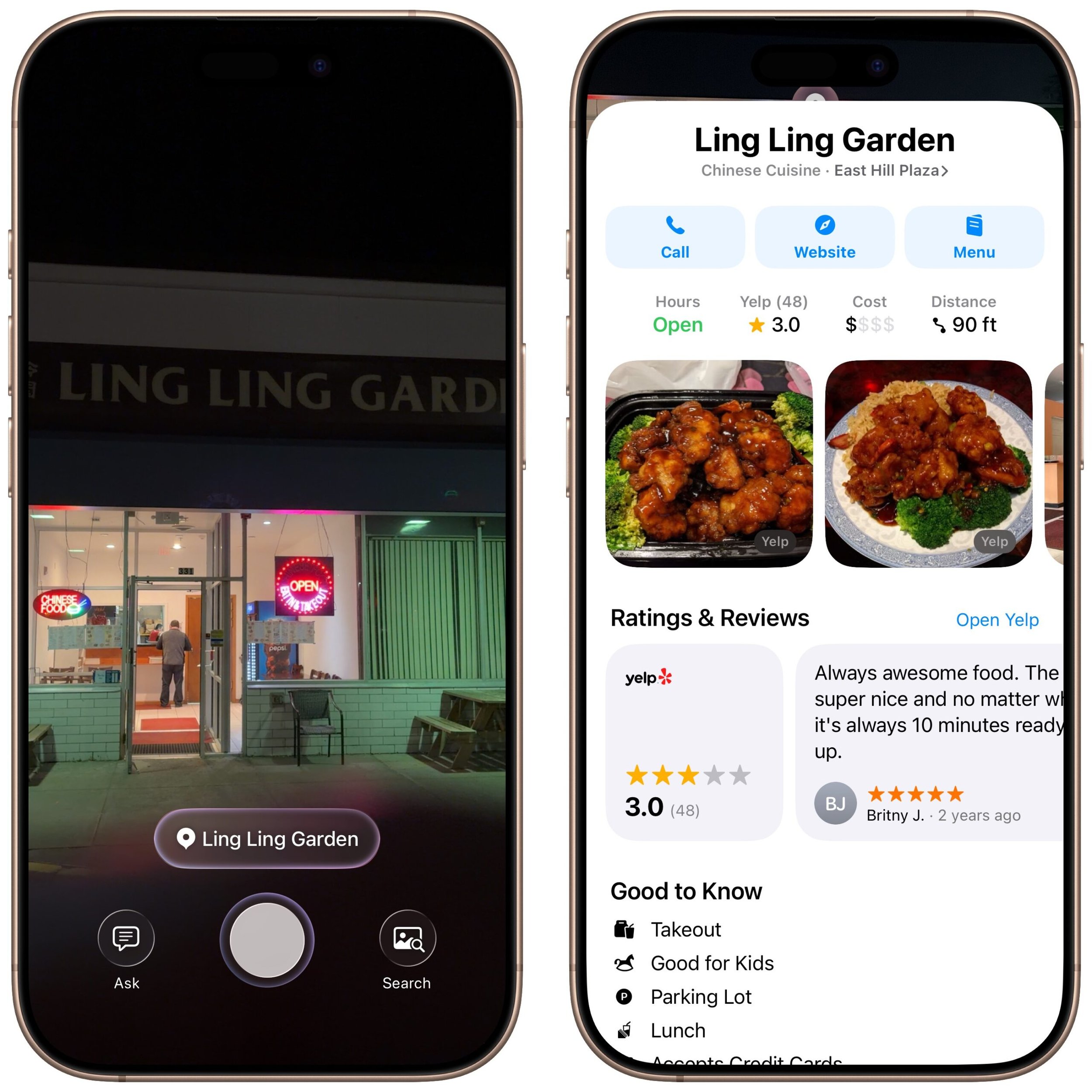 Businesses and locations: When you capture an image of a business or other location that’s known in Maps, visual intelligence can show hours, menus, reviews, and more.