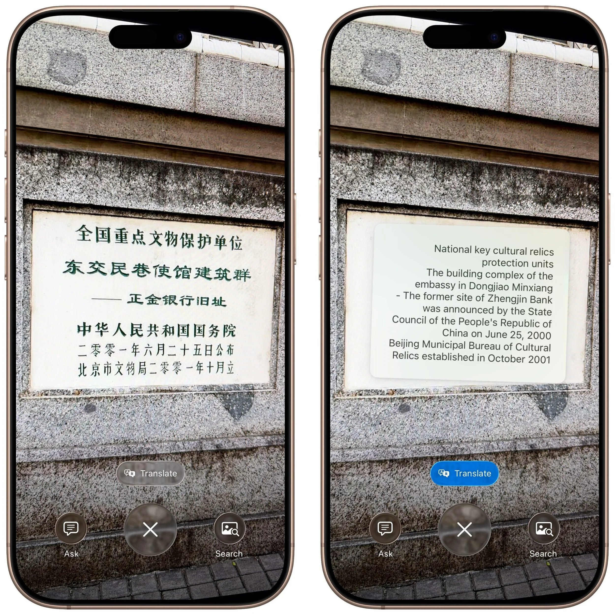 Translate text: iOS offers multiple ways to translate text in unfamiliar languages, including the Translate app, but visual intelligence is often the fastest way to get a quick translation of a sign or placard.