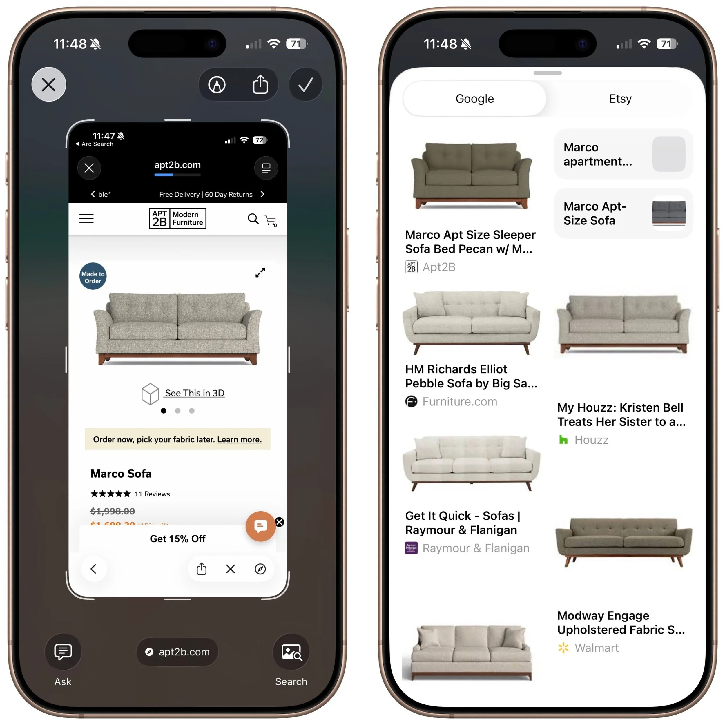 Search for products: Shopping for something? Once you find an example of what you like—such as this mid-century modern sofa—take a screenshot, circle the picture with your finger, and browse the search results for similar items.