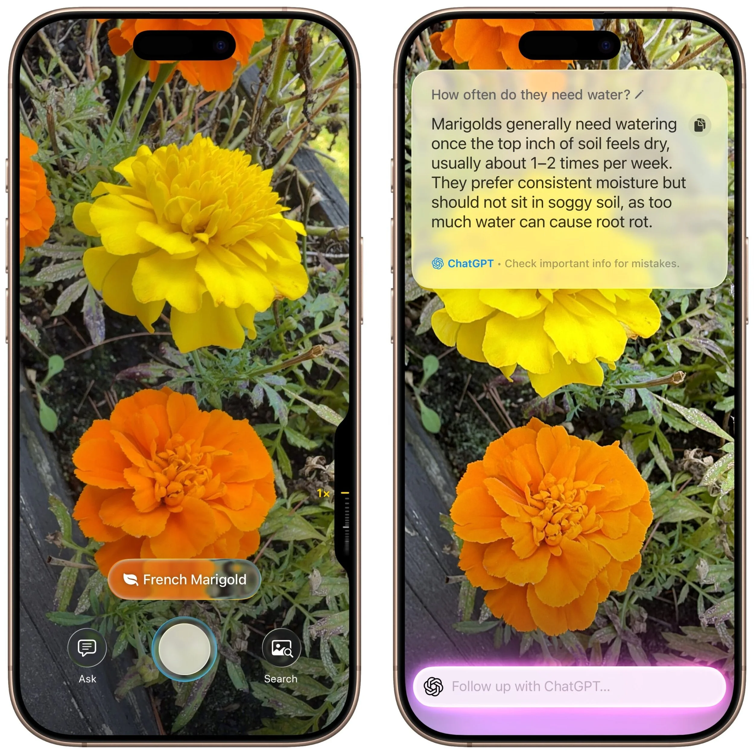 Research questions: Sometimes, you know what you’re looking at but have questions about it. Instead of starting a new search, you can use visual intelligence, tap the Ask button, and pose your question to ChatGPT. Tap the response to ask a follow-up question. If you connect Apple Intelligence to your ChatGPT account in Settings > Apple Intelligence & Siri > ChatGPT, your conversations will be saved in ChatGPT, where you can review and continue the discussion.