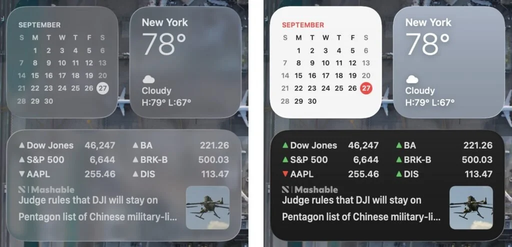 Widget style: Desktop widgets are now mostly transparent when any window is open on the desktop, and they become solid only when the last window is closed or hidden. You can adjust this setting in System Settings > Desktop & Dock > Dim widgets on desktop. Widgets also adopt the same clear or tinted style used by icons.