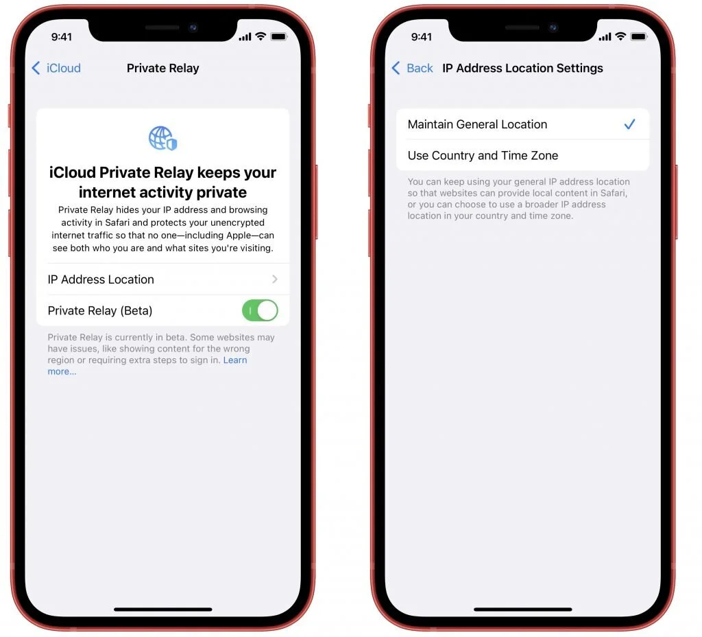 To enable the feature, go to Settings > Your Name > iCloud > Private Relay (Beta) and turn on the switch for Private Relay (Beta). In the IP Address Location Settings screen, you can choose whether iCloud Private Relay should try to maintain your general location or just make sure it gets your country and time zone correct.